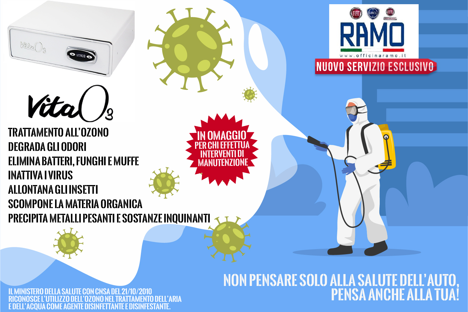 Da sempre ci prendiamo cura della vostra auto come se fosse la nostra, specialmente in questo momento di difficoltà. Per assicurarvi la totale pulizia della vostra auto, dai sedili fino alle vie di aerazione, abbiamo scelto l’efficiente sanificatore ad Ozono “Vita O3”.